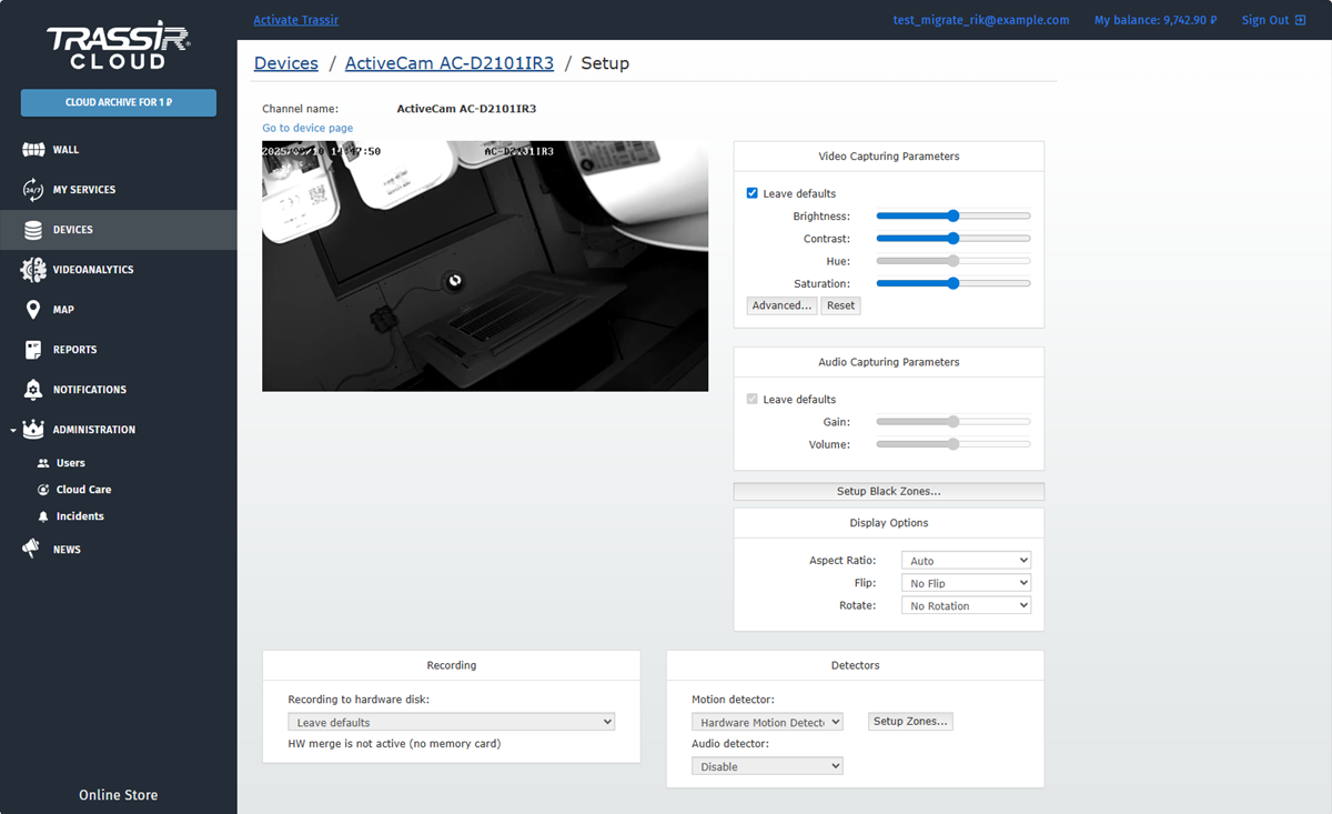 Detectors - this area allows configuring motion and sound detectors, used to activate Archive recording to TRASSIR Cloud and motion and sound notification options.