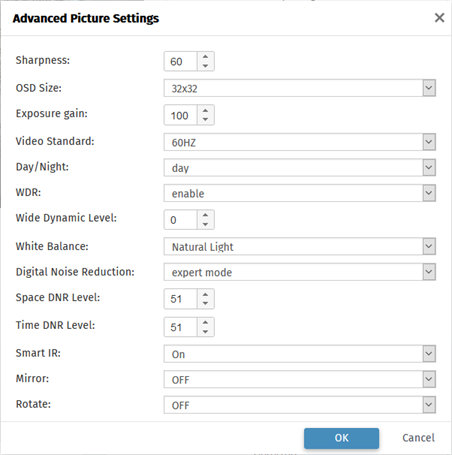 - Check the Leave defaults box in order not to send the settings to the device. If this option is selected, the settings won't change. This option can be used, for example, if the settings were previously changed in an IP camera's interface.