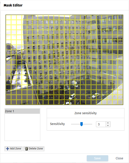 Press Setup zones... and Setup audio... buttons to go to the corresponding detectors zones' editors. The Zone sensitivity and Threshold parameters define the sensitivity level of each detector. If that level is exceeded, the detector triggers.