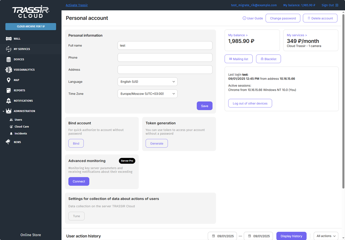 - Manage personal data: update your information, change your password, delete your personal account, and link your TRASSIR Cloud account to various authorization services.