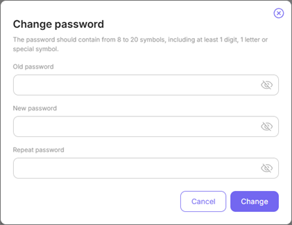 To change your password, click the Change password button. In the window that opens, enter your old and your new passwords