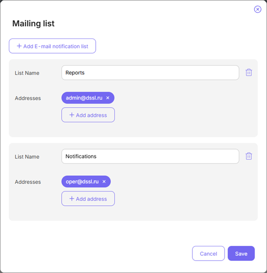 The cloud offers a wide range of options for your video surveillance system monitoring. You can define and build the mailing lists for Notifications or Device operation reports.