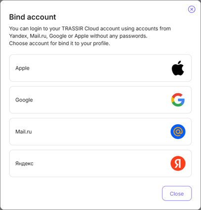 Press Bind. This will open a window where you can link your TRASSIR Cloud account to various authorization services. You can then use them for authorization in TRASSIR Cloud.