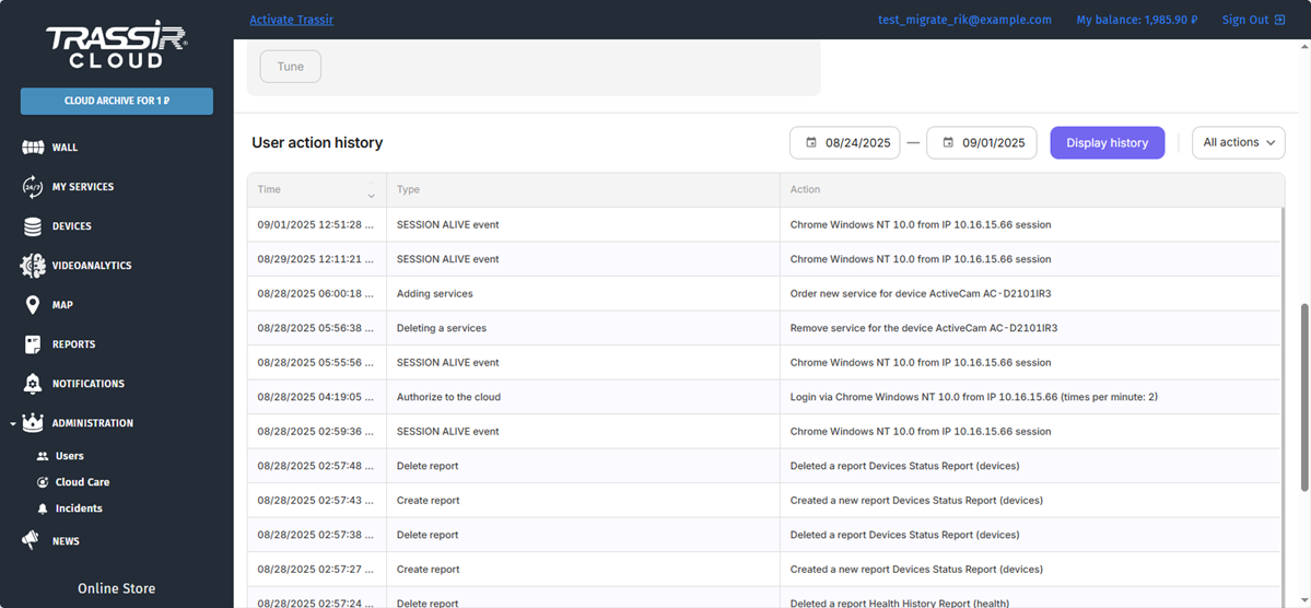 The User action history block shows manipulations with your account. To display the particular information, change the filter settings and click the Display history button.