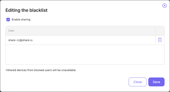 Click the Black list button to enable the Enable sharing option, view blacklisted users, or remove them from the black list.