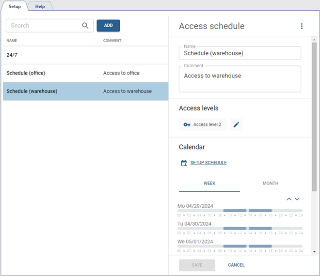 Access schedules downloaded from the TRASSIR ACS Enterprise server are not available for editing and use in the TRASSIR ACS access level configuration. See TRASSIR ACS Enterprise user manual for details (see Access schedule).