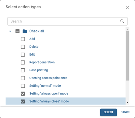 This section provides a convenient way for the user to review all actions taken in various sections of TRASSIR ACS, including auditing the actions of operator over access points, pass cards layout editor, and pass cards printing.