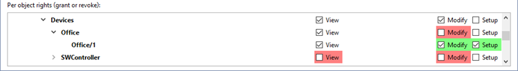 You can use the rights to the individual server objects to set different options to access viewing and editing functions of devices.