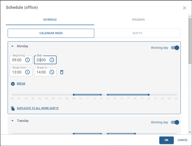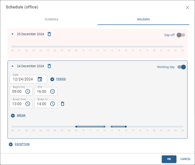 The Holidays tab lets you add the dates, in which another schedule will be in effect (for example, on pre-holiday and holiday days). |