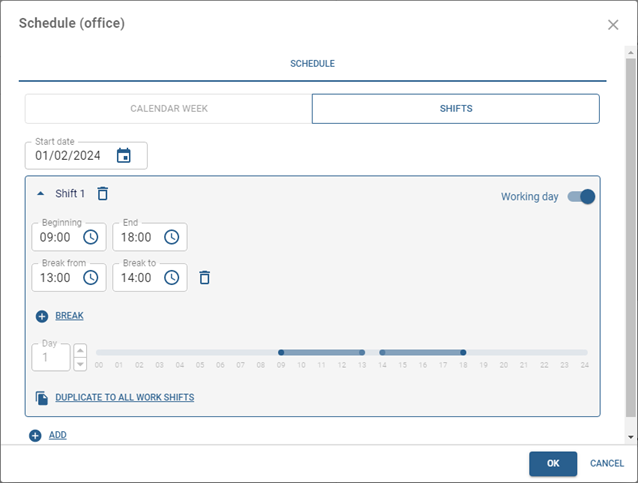 - Shifts is a schedule that specifies a cycle of intervals in which the work schedule depends on the day number in the cycle.