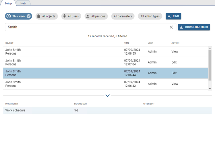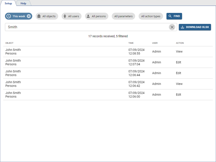 Various search criteria such as Time interval, Objects, Users, Persons, Parameters, and Action Types are conveniently provided to help you quickly find the information you need.