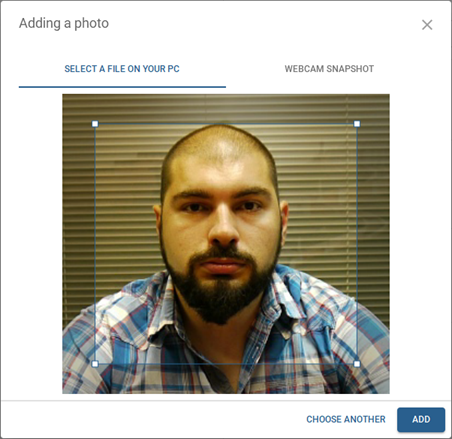 In the opened window, select one of the ways: Select a file on PC or Webcam snapshot and add an employee photo.