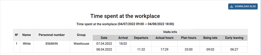 Time spent at the workplace - a report on attendance, time of arrival/departure, as well as the late arrivals and early departures built on a common work schedule selected in the report settings.