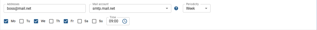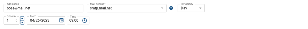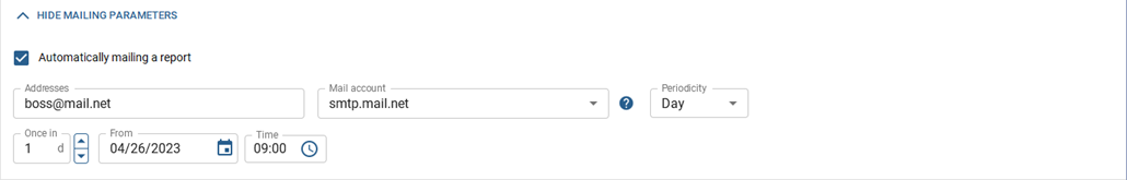 You can set up automatic sending of reports by e-mail. To do this, set theAutomatically mailing a report flag in the Mailing parameters list.
