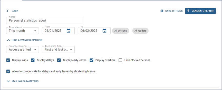 When you create an Attendance report or a Personnel statistics report, Allow to compensate for delays and early leaves by shortening breaks is automatically checked. If the employee did not leave for lunch break or did not leave for the entire interval, the unused break time will compensate for the delay or early leave. If the option is not checked, the unused break time will not compensate for early leaves and delays when calculating the time worked.