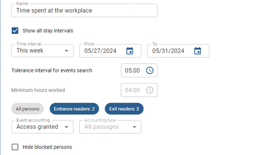 You can choose the length of the tolerance intervals, within which the system will search for events (employee entries and exits) regarding the selected Time interval in the Tolerance interval for events search field.