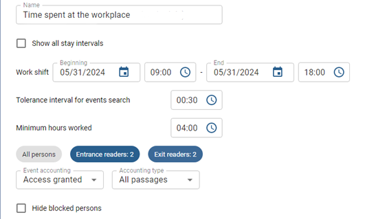 The Time spent at the workplace report filter parameters are customized depending on the Show all stay intervals checkbox: