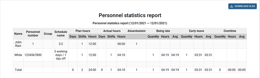 Personnel statistics report - a summary report on the person's time at the workplace.