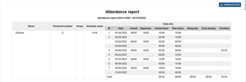 Attendance report - a report of attendance, time of arrival/departure, overtime, as well as on late arrivals and early departures, built on the working schedules of the selected settings of the persons.