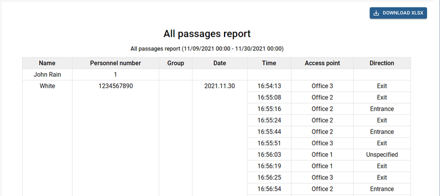 If only one event (i.e. entry or exit) within the Time interval is found, considering the Tolerance interval for events search, it will be displayed as a blank line in the report.
