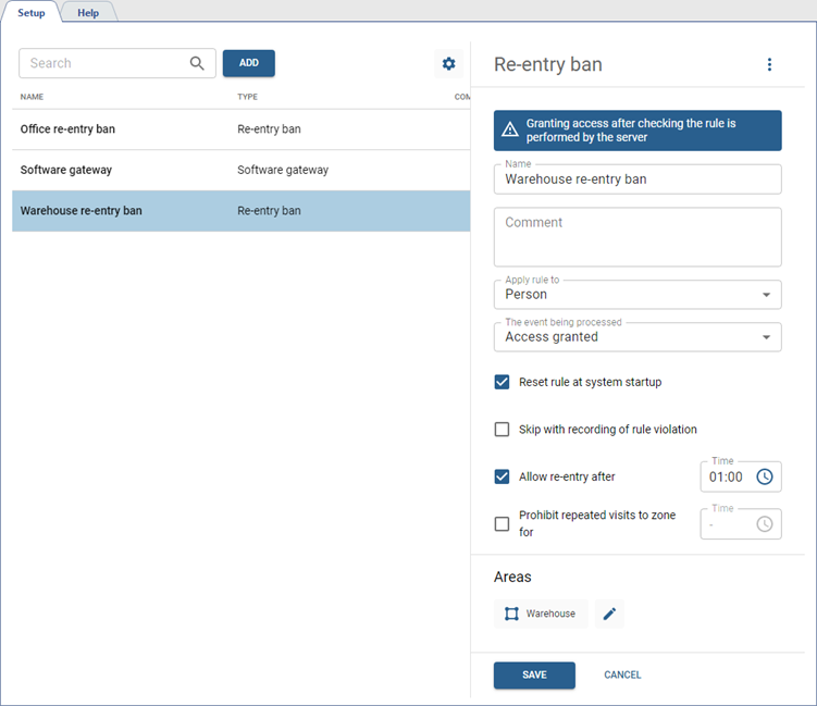To create a new rule, press Add, choose Re-entry ban and proceed as follows: