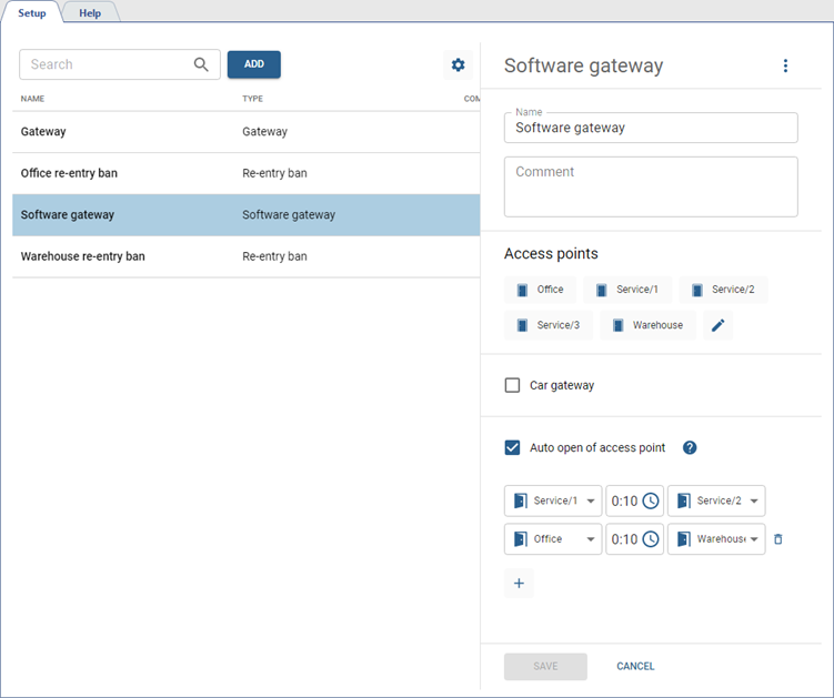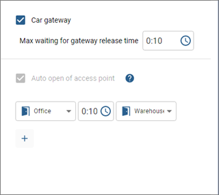 If you need one door of the gateway to open automatically after the closure of the other door, check Auto open of access point, select the relevant access points and countdown time to the opening of the second door: