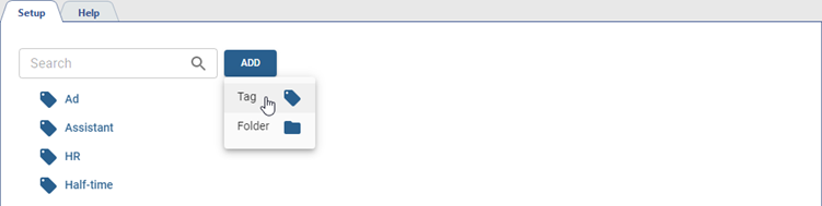 This section allows you to create, edit, and delete tags, as well as group them into folders. To open the section, go to Plugins -> Access Control -> Tags. To add a tag, click the Add button, select Tag.