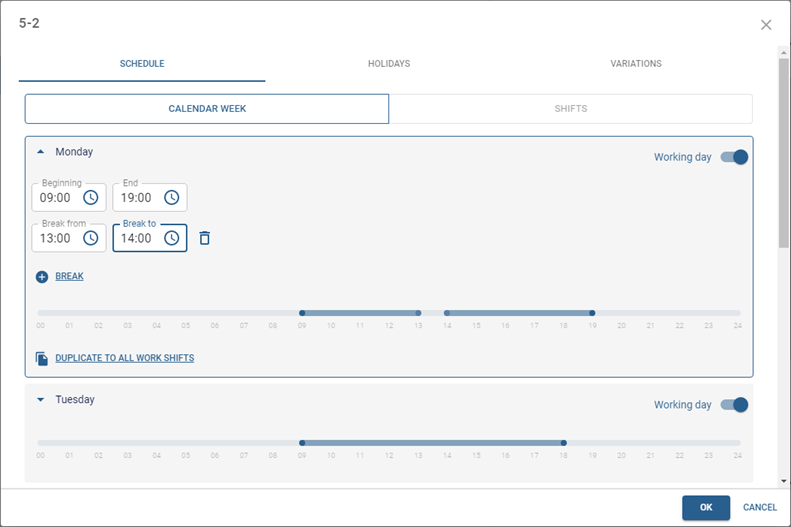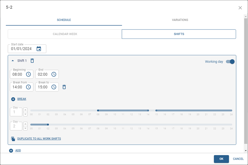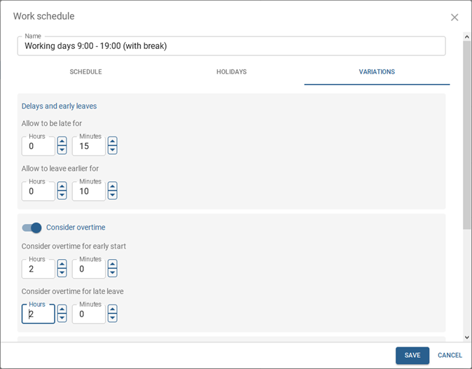 The Variations tab provides parameters that can be used for more flexible customization of the employees' working schedules.