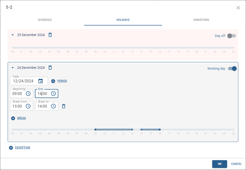 The Holidays tabs lets you add the dates, in which another schedule will be in effect (for example, on pre-holiday and holiday days). |