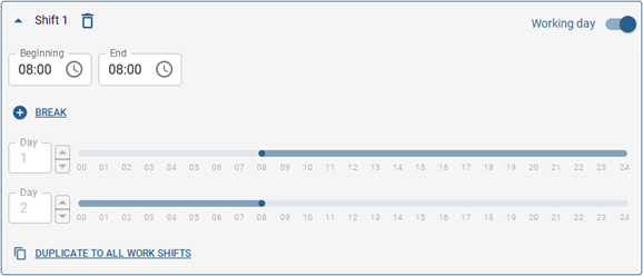 In order to create a shift that begins on one day and ends on another, choose the time in the End field that is less than or equal to the time in the Beginning field.