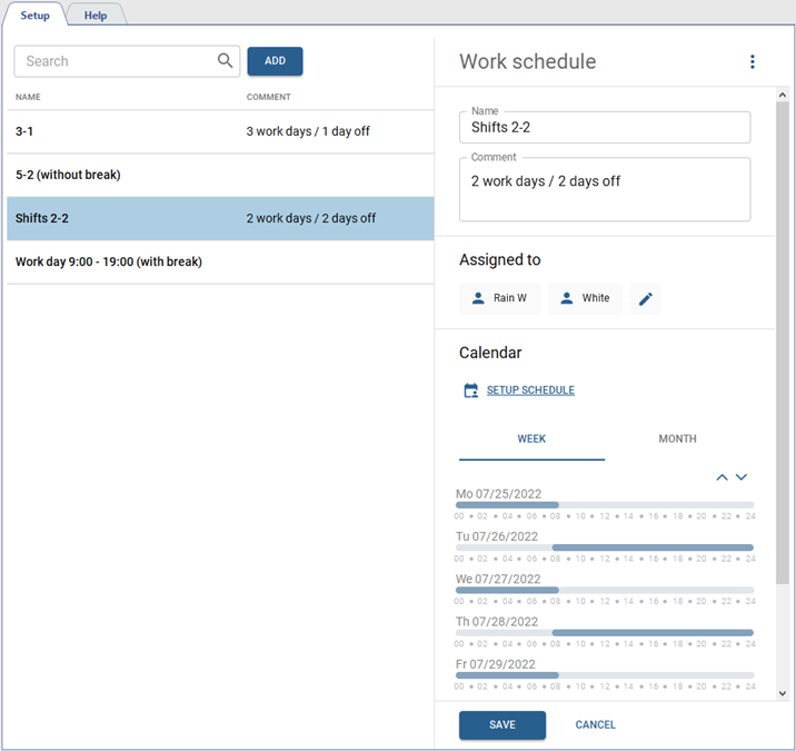 This section allows you to create and edit work schedules that are used to determine the working time of an employee when building various reports.