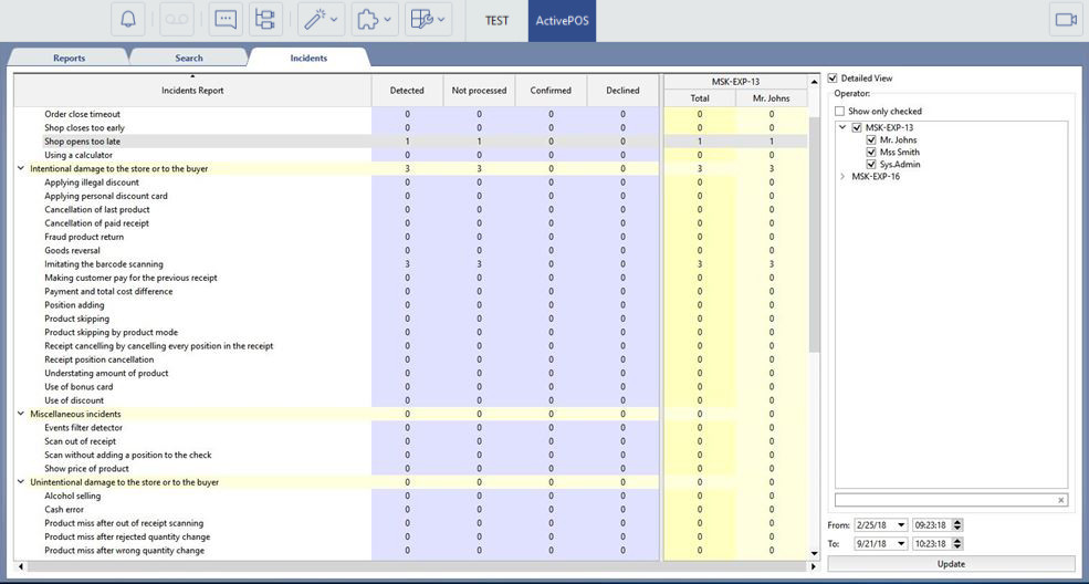 The incident report includes all of a cashier's or retail outlet's violations, which were detected using the sensors configured by the administrator. When an incident or a violation is detected, it is assigned with "Not viewed" status. Only after analyzing the available data can an expert or operator assign the status of "Confirmed" or "Dismissed" to an incident, thereby either confirming or dismissing the violation.
