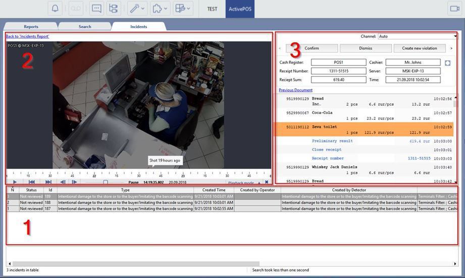Now you can select an incident from the list and double-click on the incident's line to begin analyzing it. The video archive and data obtained from the POS terminal will help you make a final decision about the selected incident. You can decide on one of three options: