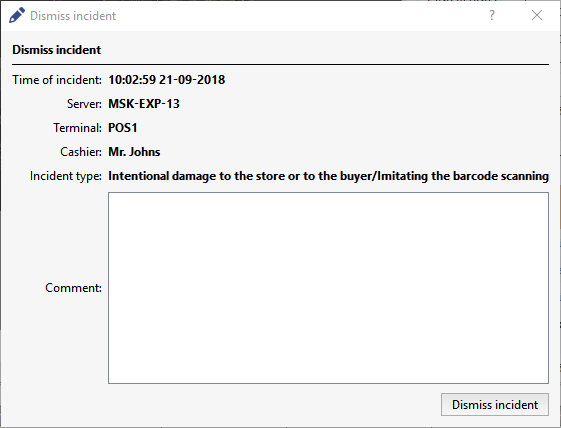 - Dismiss. This option changes the status to "Dismissed" and you can indicate the reason for dismissing the incident as a comment.