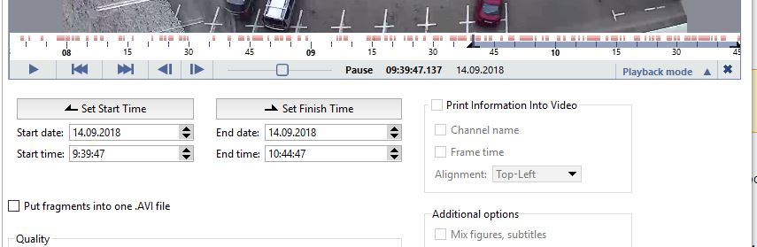 The right part of the window contains settings for the selected archive fragment. Move the mouse cursor along the timescale to determine the fragment's start. If necessary, adjust the values in the Start date and Start time fields. In order to record the selected time as the starting point for the exported fragment, click the Set start button.