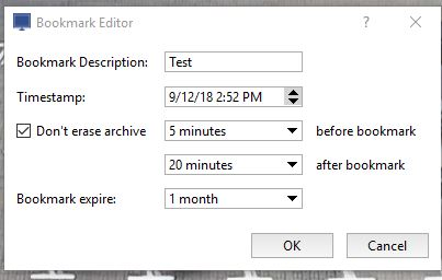 - Don't erase archive - This checkbox determines if the segment of the archive associated with the bookmark should be preserved. Since old recordings are eventually overwritten, the archive could be deleted along with the bookmark. In order to prevent this from happening, check this checkbox and specify the duration of the video segment that will be preserved when the archive's other recordings are deleted.