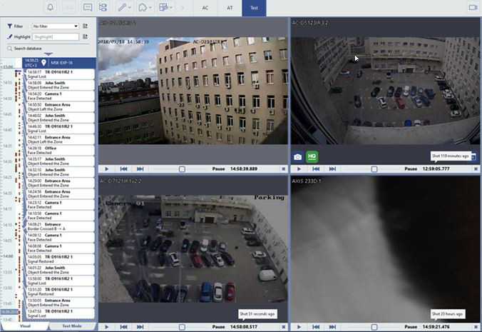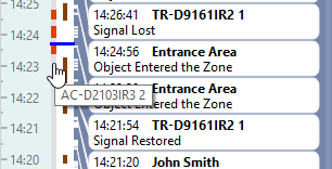 On a single timeline of the event log you can see the information about the availability of the archive for several cameras at once. The timeline contains the information about all cameras in the archive review mode. The dark red bar indicates the availability of the archive of a particular camera.