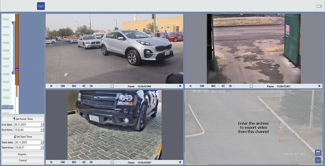 In order to analyze complicated situations, sometimes an archive fragment, recorded from different cameras at the same time, is required for further review. It can be realized by exporting archive from each channel. In this case you'll watch all saved video files in series, while reviewing the archive.