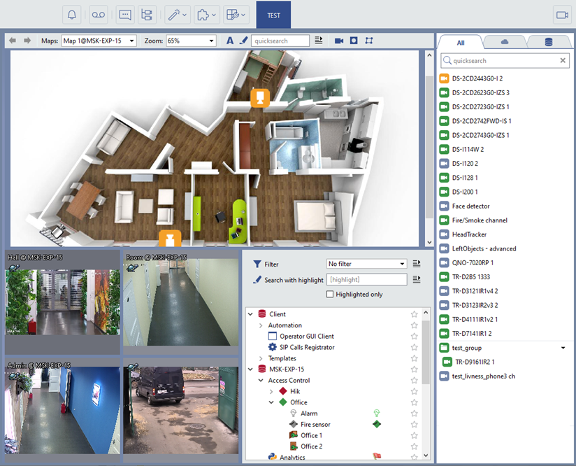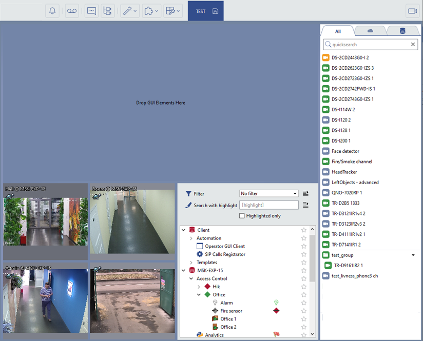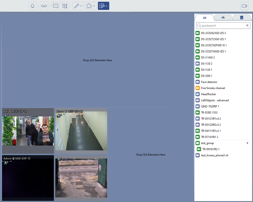 - Drag the signals from 4 cameras onto the newly created layout. The list of cameras is located on the right; if it is hidden,