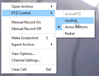 - Right click and in the opened context menu select PTZ Control -> Joystick.