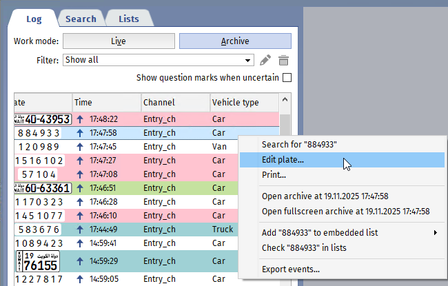 Make a correction in the AutoTRASSIR/AutoPass log. To do this, point the cursor at a line with a license plate number that was not recognized in whole or in part, and select Fix Plate... in the context menu. A window will open with the archive segment that contains the passing vehicle.