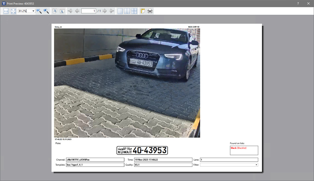 To bring up the print menu, point the cursor at a line with a license plate number and select Print... in the context menu. A window will open with a print preview of the document.