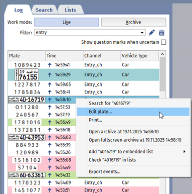 - open the archive to the moment at which the license plate number was recognized (in the current window or in fullscreen mode);