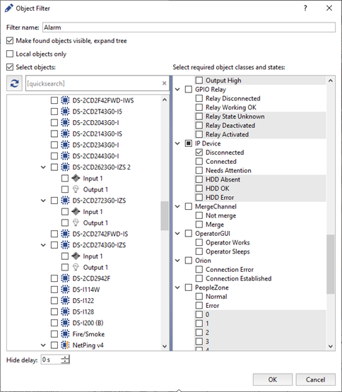 The Hide delay parameter changes the time period in which an object is displayed in the list before its status mismatches the selected filter.