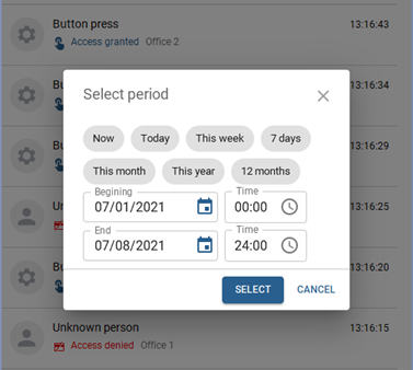 In order to display events for a specific time period in the log, click on the time filter and select the required range.