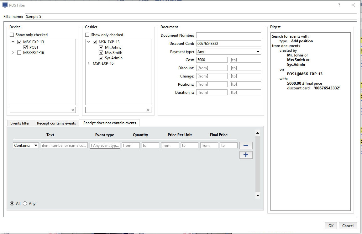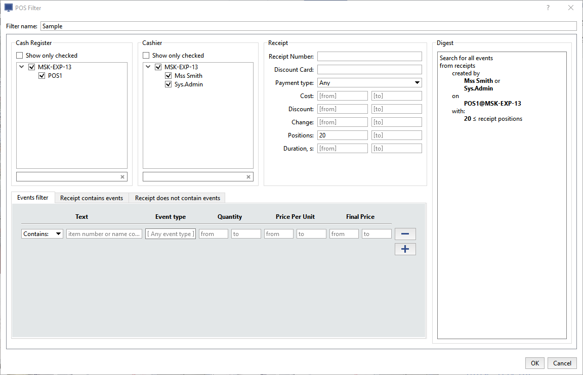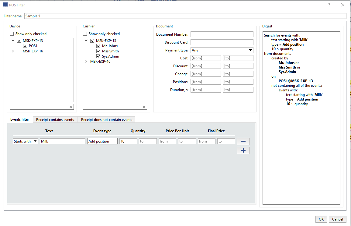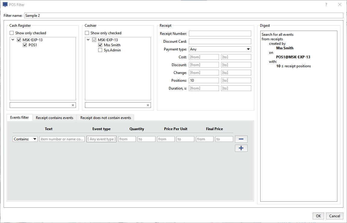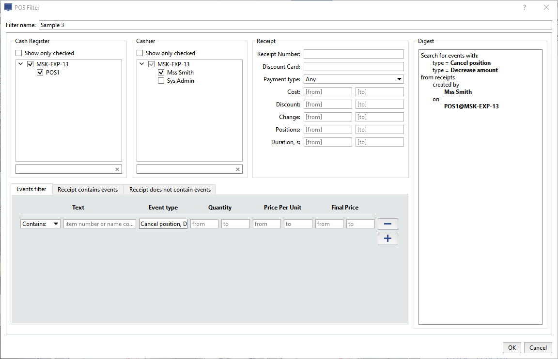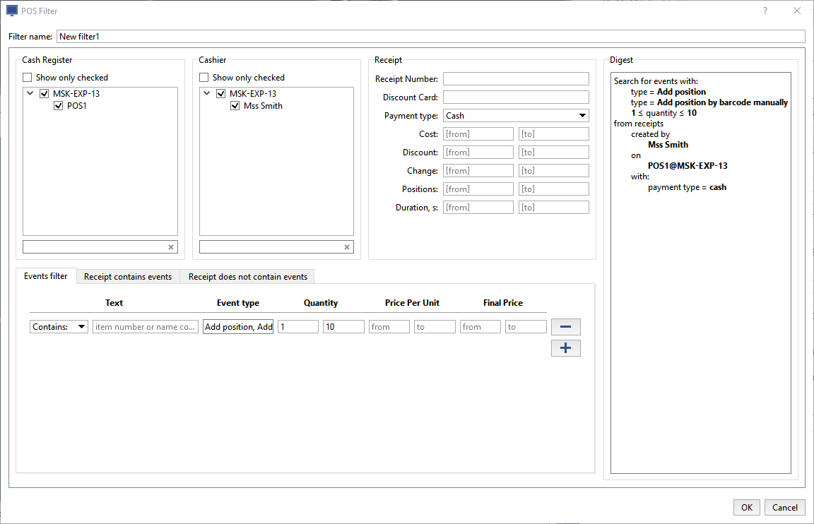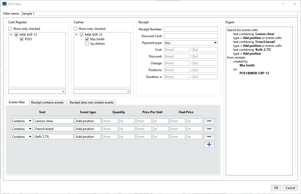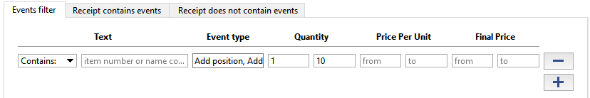 - The settings on the Receipt contains events and Receipt does not contain events tabs make it possible to reduce the size of the list of events found using the settings on the Events filter tab and display only those events contained or not contained in the given receipts. For example, if you need to find all events where a position named "Milk" was added to receipts with more than 10 positions.