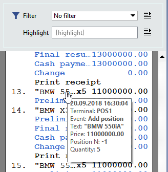 - List of receipt positions. In general, each position is characterized by a cash register event type (for example, "position added", "subtotal", "receipt" quote), some text, the quantity, and the price.