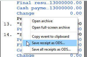 - Save receipt as ODS... and Save all receipts as ODS... - Saves the selected receipt or all receipts in OpenOffice.org Calc format.