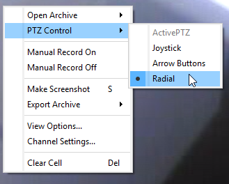- Joystick - Manual control in which the operator positions the camera by using the mouse to indicate its direction and rotation speed.