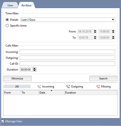 - Archive - this tab lets you search for calls in the IP ATS server archive.